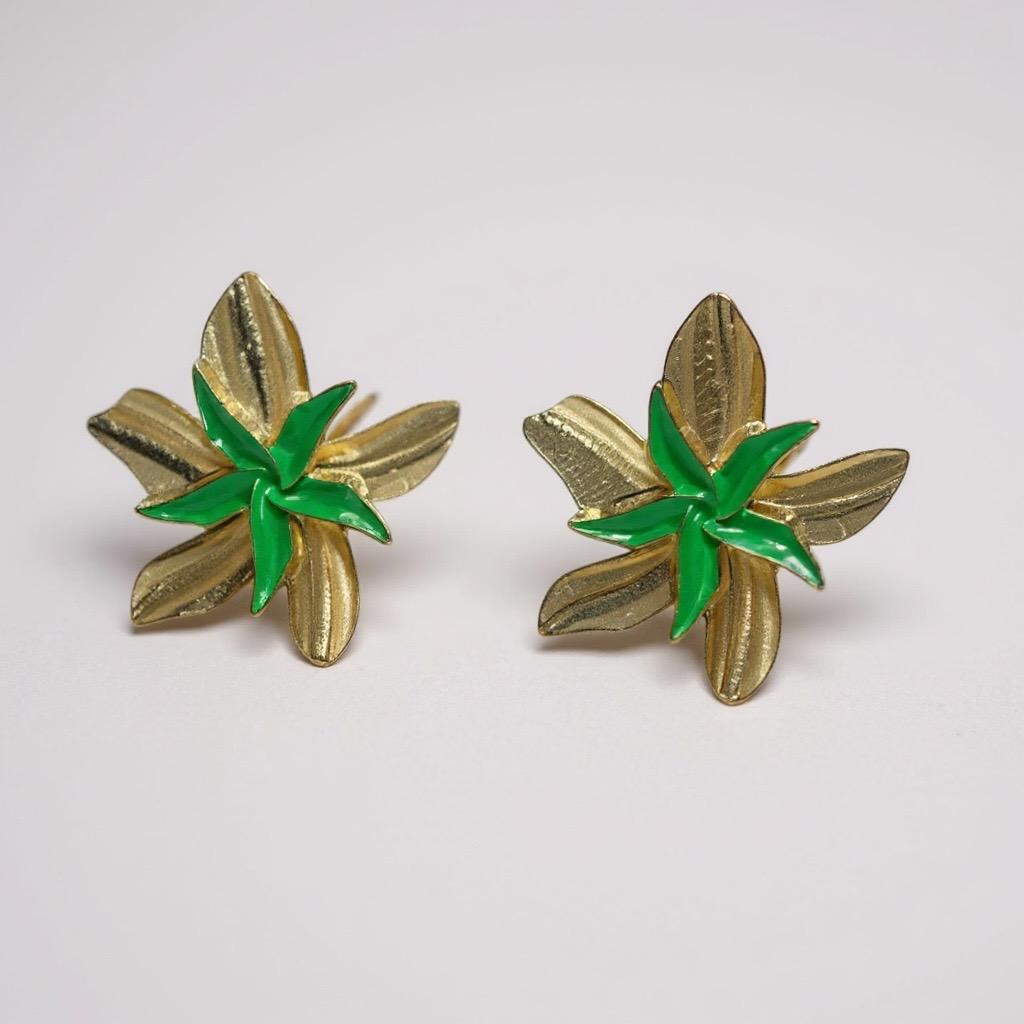 Brinco dourado em forma de folhas com resina verde no meio.