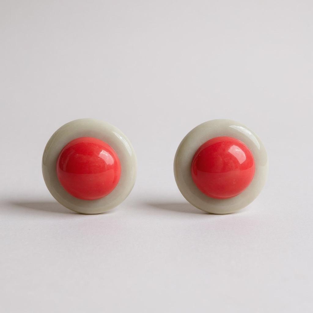Brinco redondo em resina na cor bege e no meio resina da cor pessêgo.