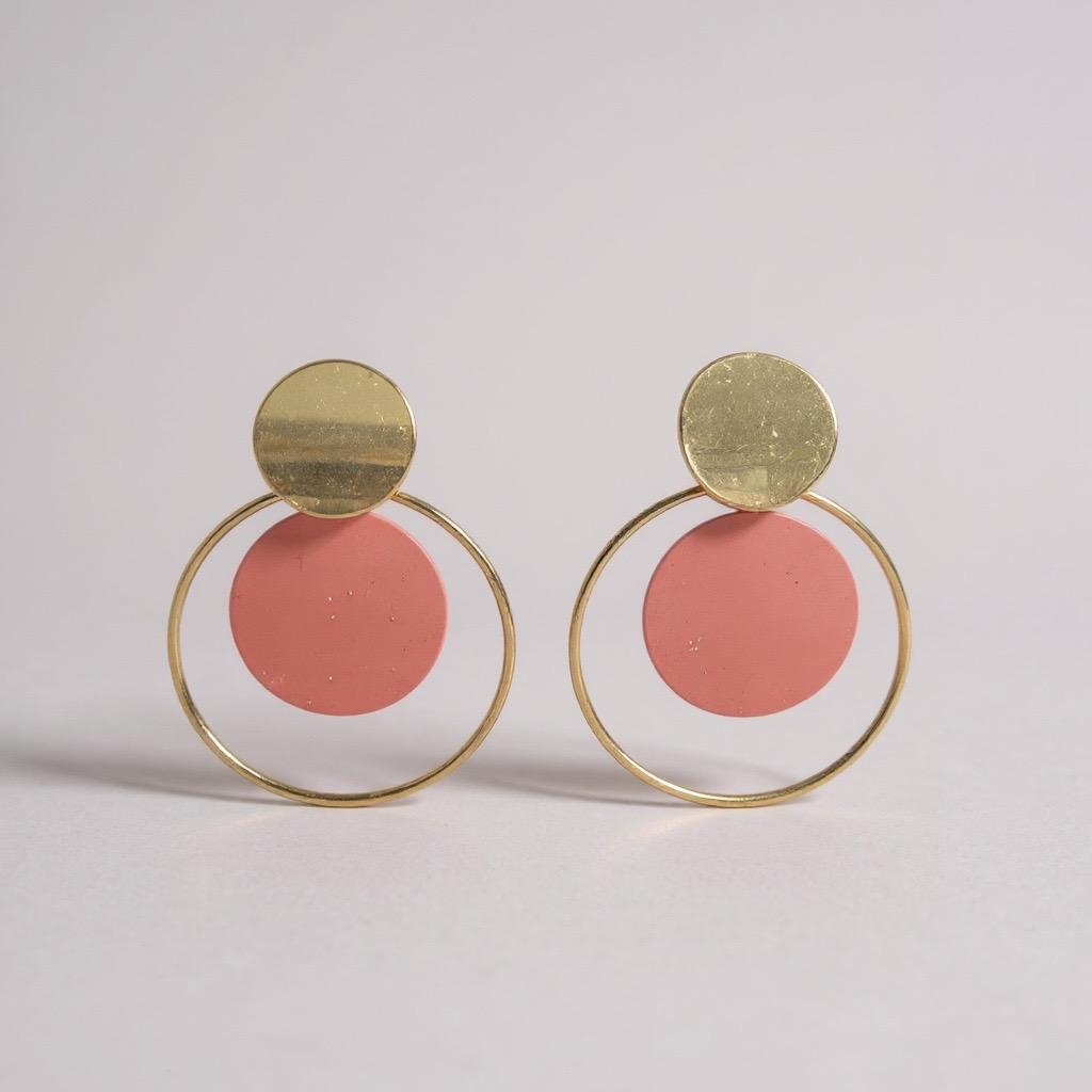 Brinco dourado com argolas penduradas e resina nude no meio.