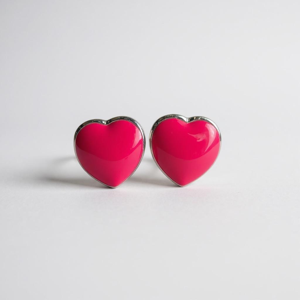 Brinco prateado em forma de coração pequeno da cor rosa pink.
