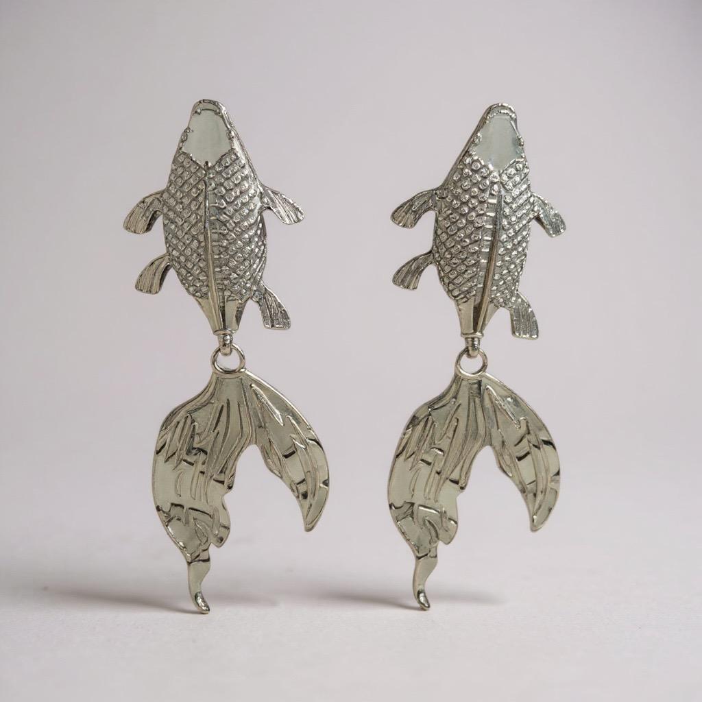 Brinco em forma de peixe, na cor prateada.