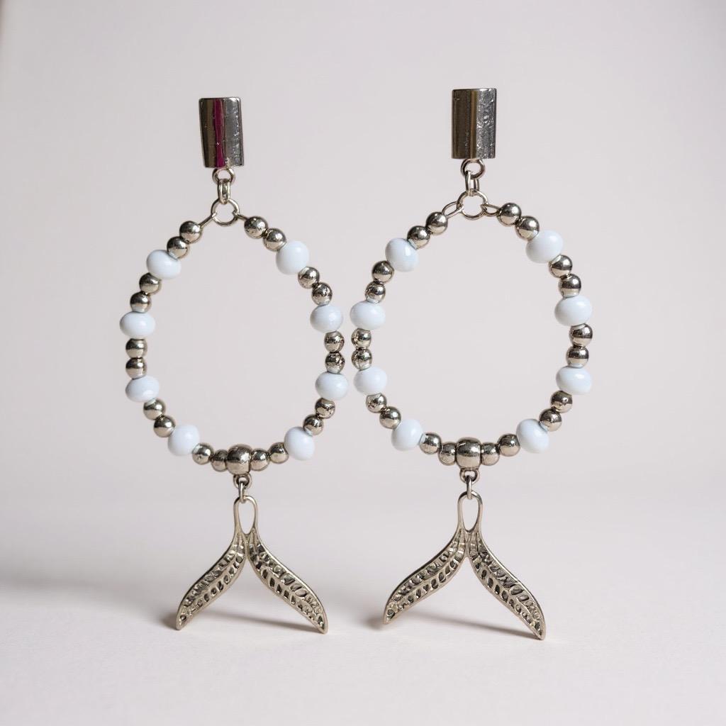 Brinco prateado com cristal na cor branca e pingente de rabo de sereia.