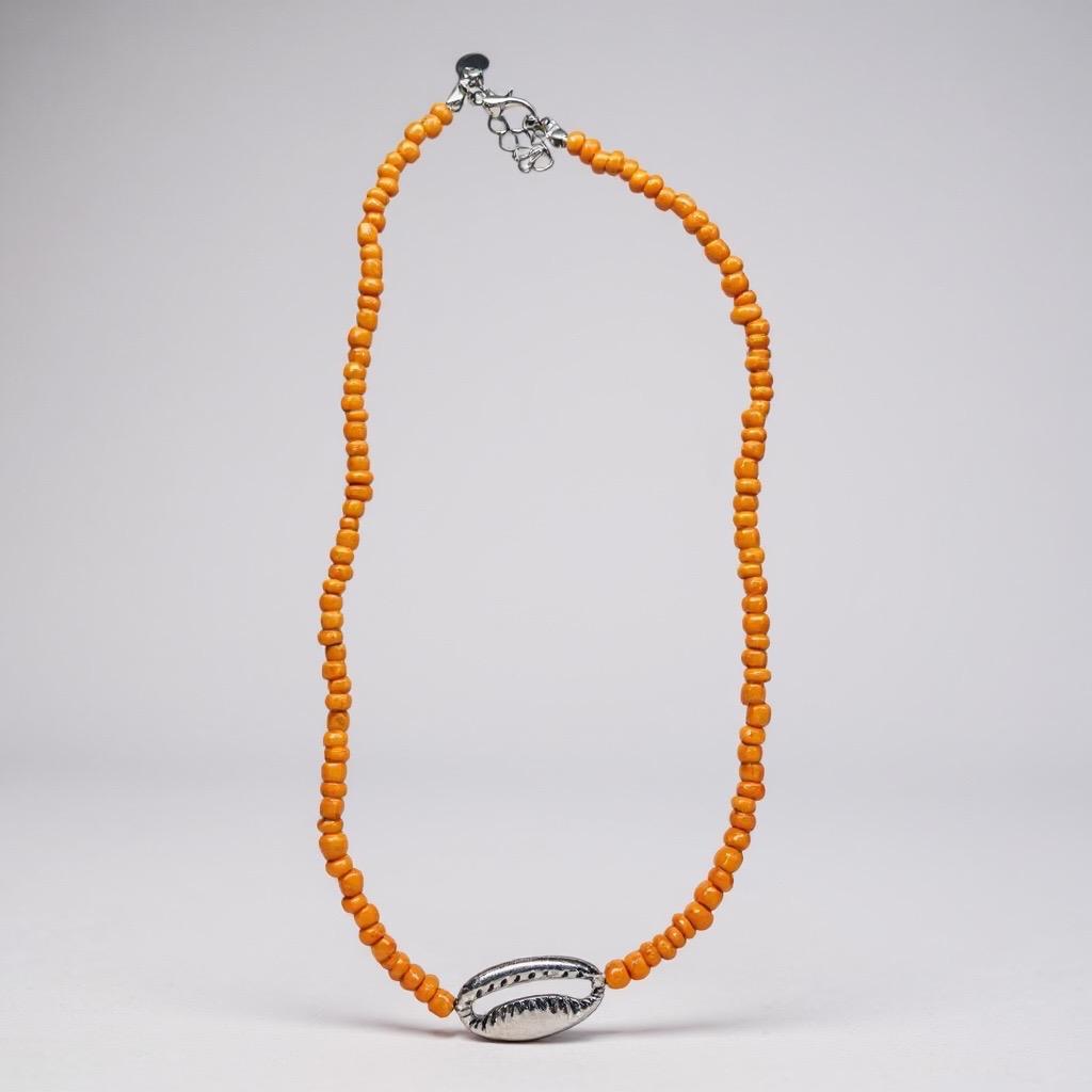 Chocker de miçangas laranjas e entremeio de metal no formato de búzios.