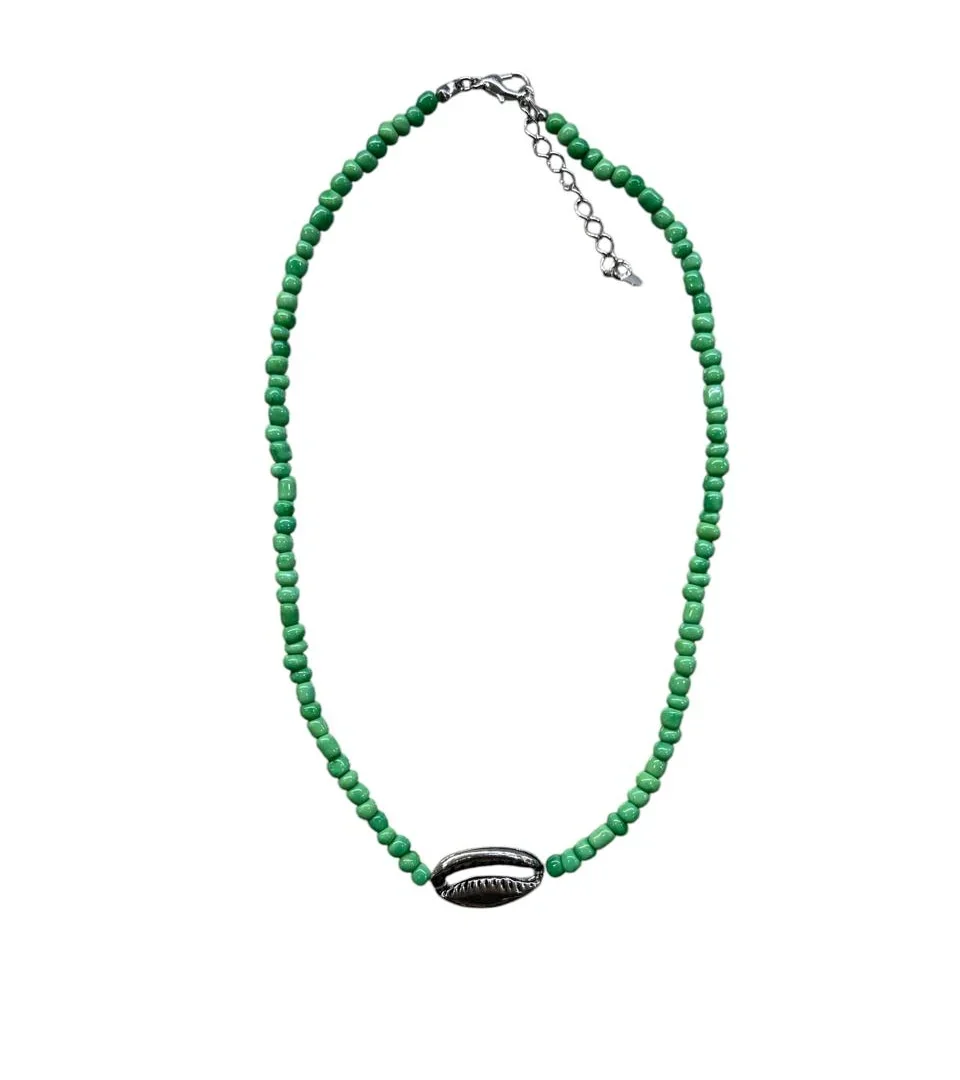Chocker de miçangas verdes e entremeio de metal no formato de búzios.