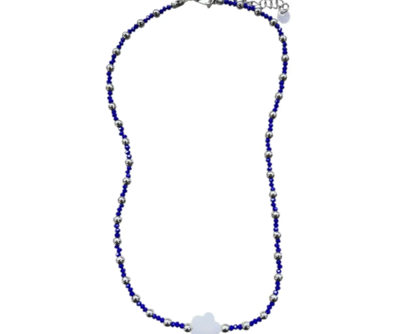 Colar de cristal na cor azul furtacor com peças prateadas e entremeio de madrepérola emforma de flor.