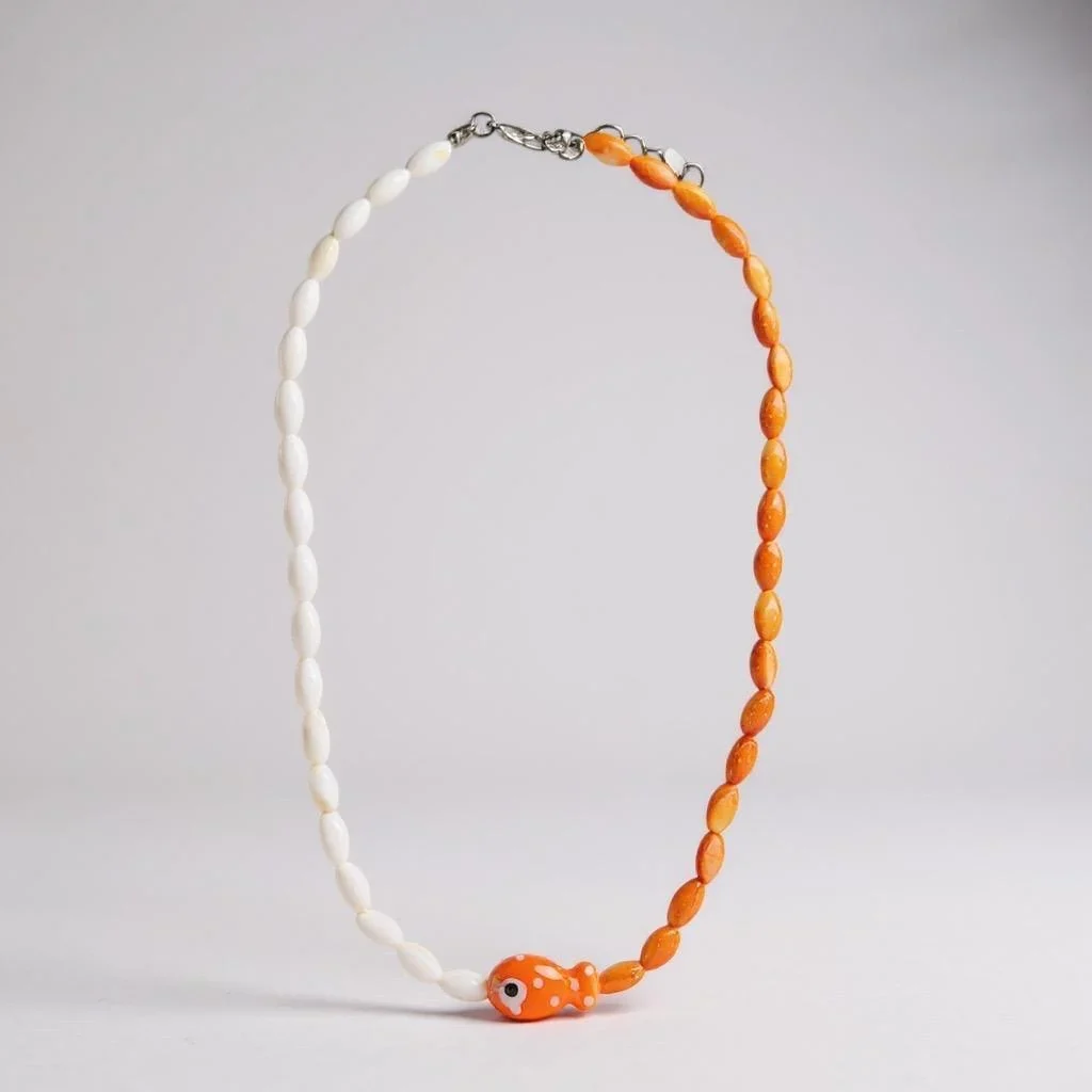 Colar de pedra bege e laranja entremeio de peixe na cor laranja.