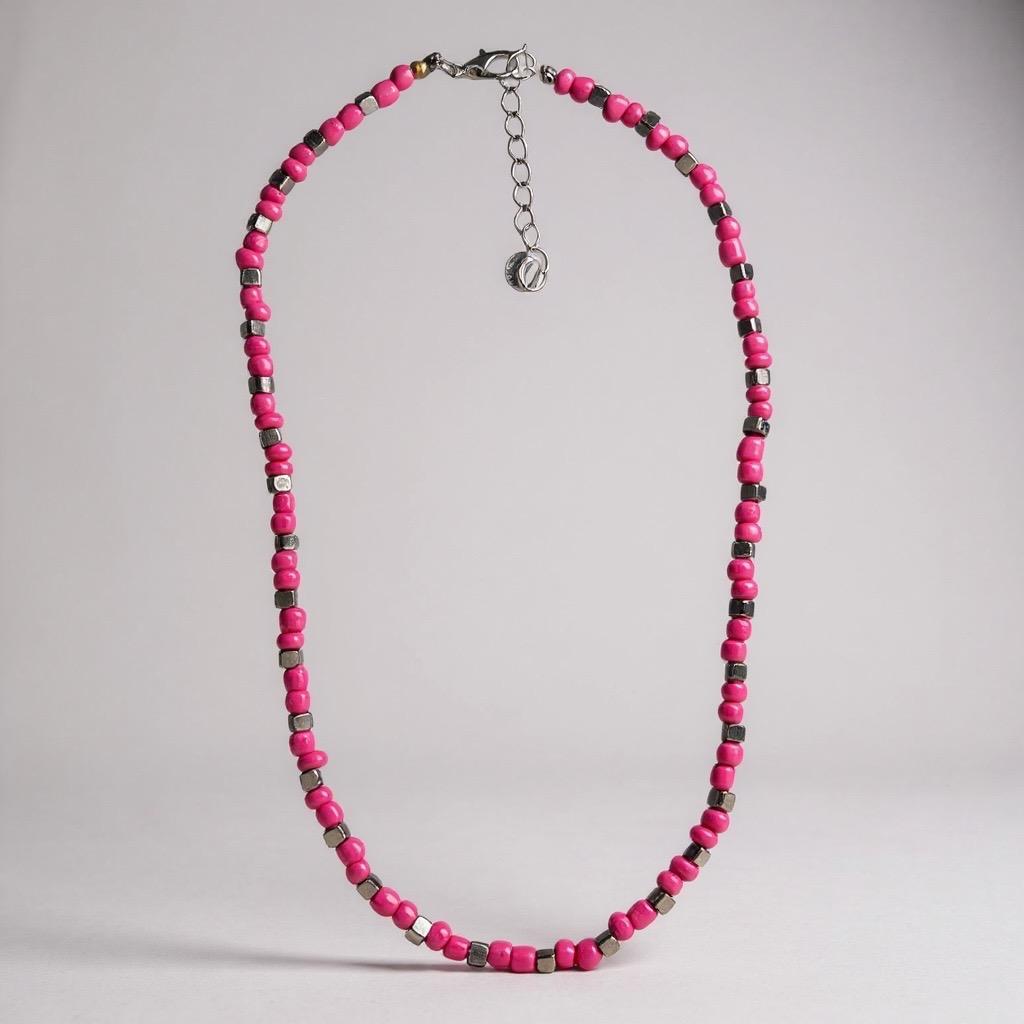 Gargantilha de miçangas rosas e entremeios quadrados prateados.