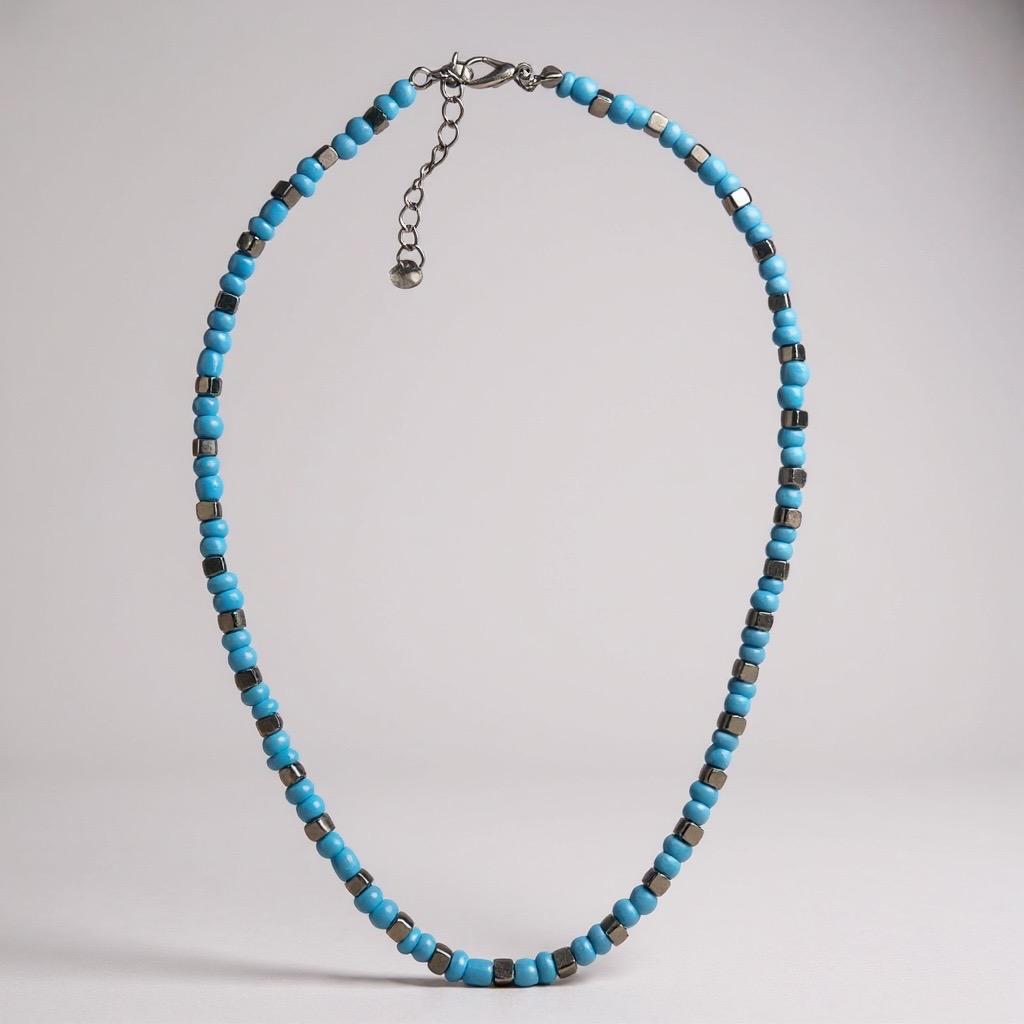 Gargantilha de miçangas azul claro e entremeios quadrados prateados.