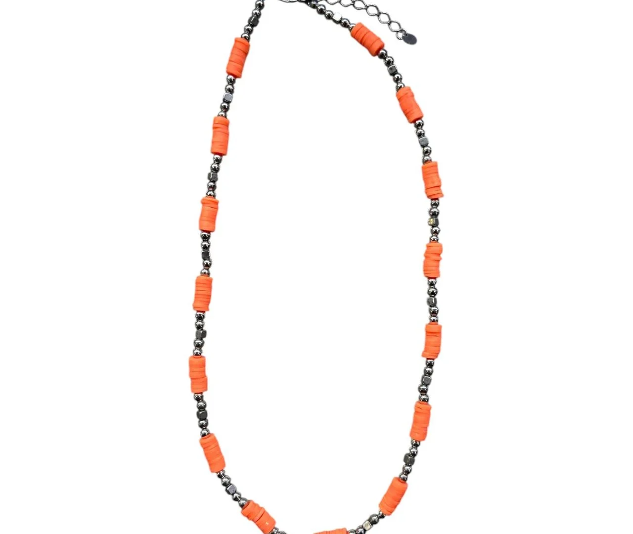 Colar de pastilhas na cor salmão intercaladas com bolas prateadas.