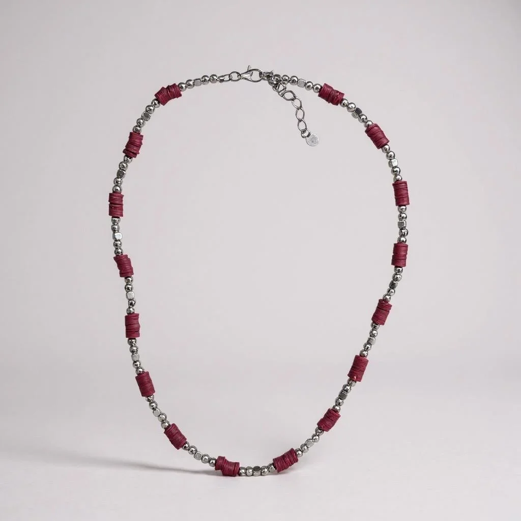 Colar de pastilhas na cor terracota escuro  intercaladas com bolas prateadas.