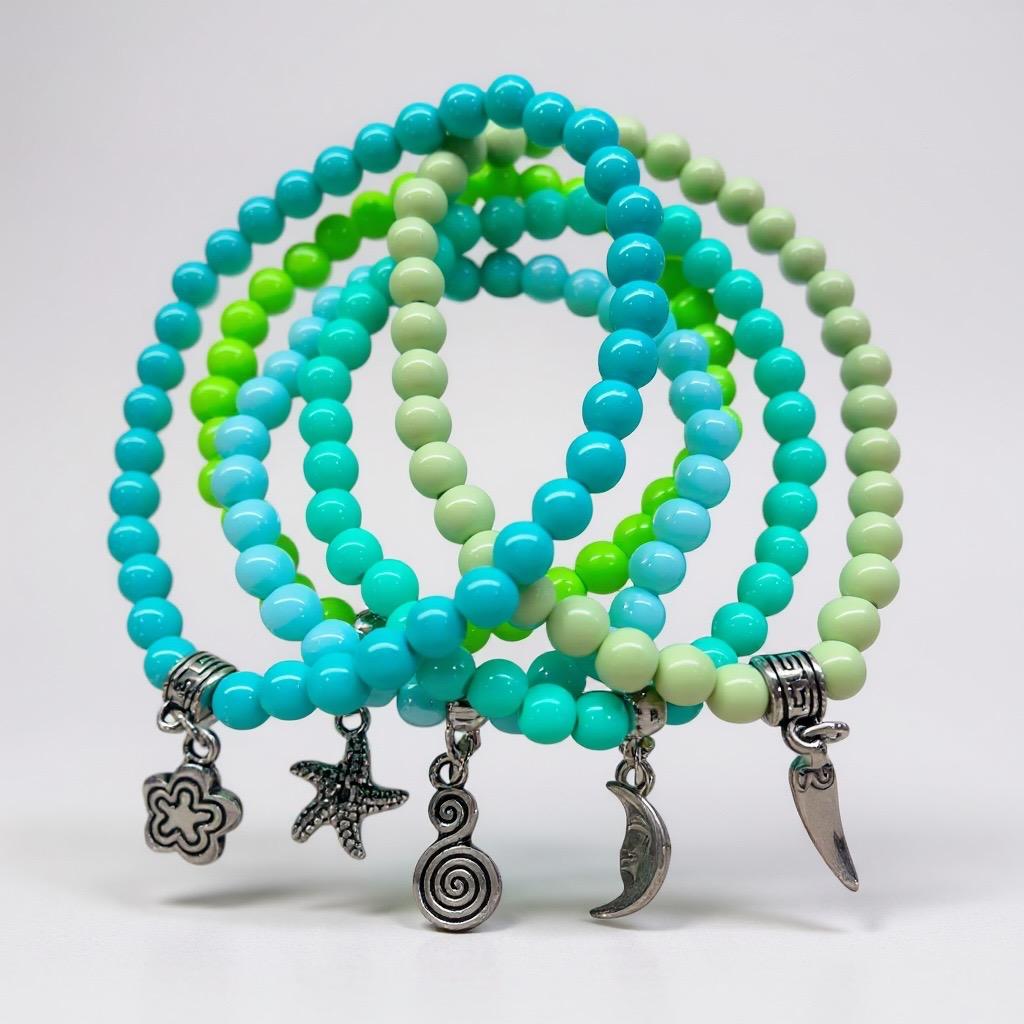 Kit com 5 pulseiras nos tons de verde, azul claro e azul escuro.